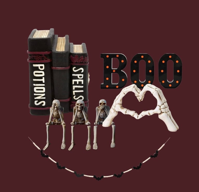Start with the gauzy backdrop, anchor your look with the spell book décor, and layer in sculptural elements like the heart hands and skeleton trio. Finish with the marquee lights and bat garland for a touch of glow and texture.